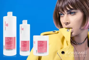 Kosswell Ideal color shampoo - Szampon do włosów farbowanych. Delikatnie oczyszcza i pielęgnuje włosy, nadaje im lśniący połysk i trwały kolor. Zawiera filtr słoneczny dla ochrony przed promieniami UV. Jego aktywne składniki współpracują ze sobą w celu zapewnienia trwałych kolorów.